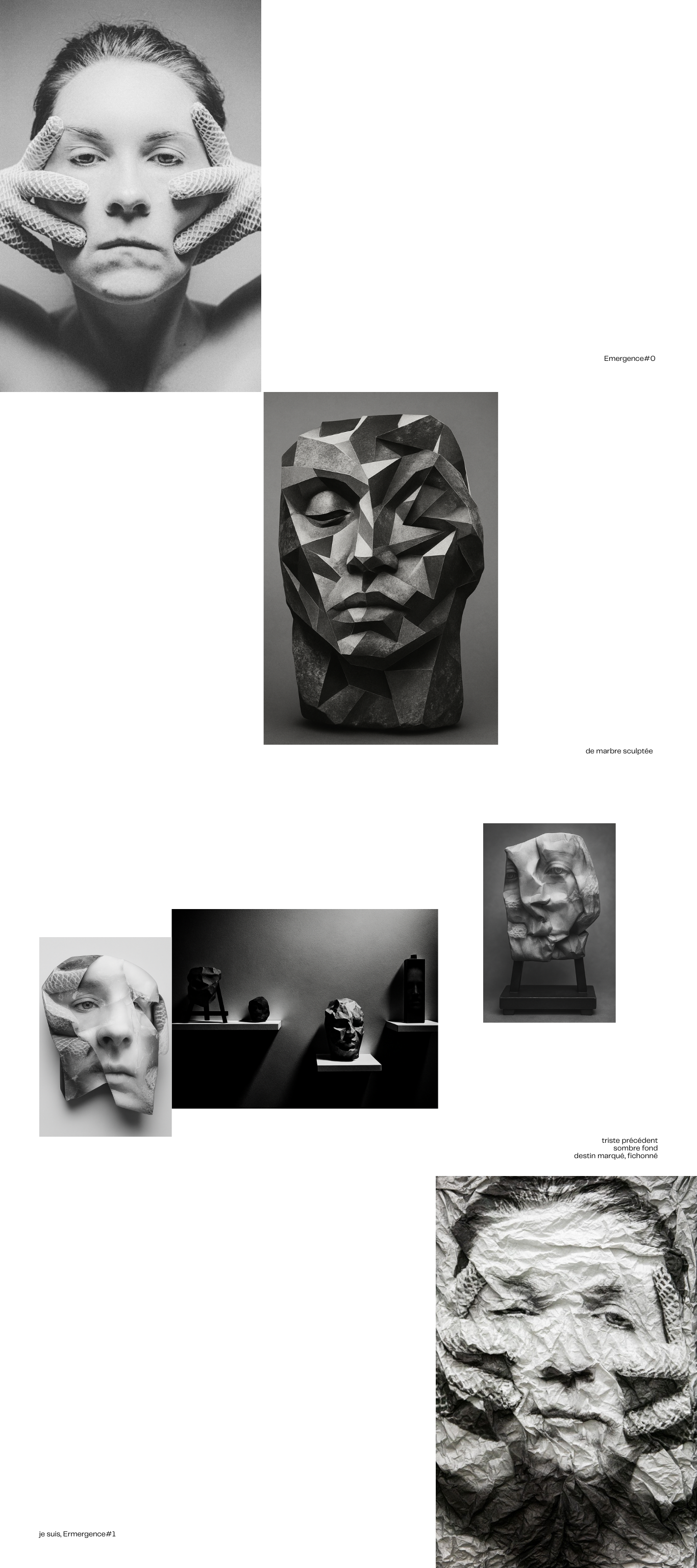 Cette « conscience de soi » qui nous distingue, nous reconnaît à l’exception de tous les autres comme un être unique, semble à la fois mouvante et indéfinissable. Cette singularité qui nous définit est-elle constante à travers l’espace et le temps ? De cette réflexion est née en 2016 le travail photographique “Emergence #0”. L’intention première était de capter l’âme au travers d’une série d’autoportraits réalisés sur le mode de l’écriture automatique. Sur des périodes de temps rapprochées, j’ai, au travers d’un travail de séquençage par l’image, engagé une démarche introspective destinée à faire émerger cette entité mienne aux contours insaisissables et en perpétuelle mutation.